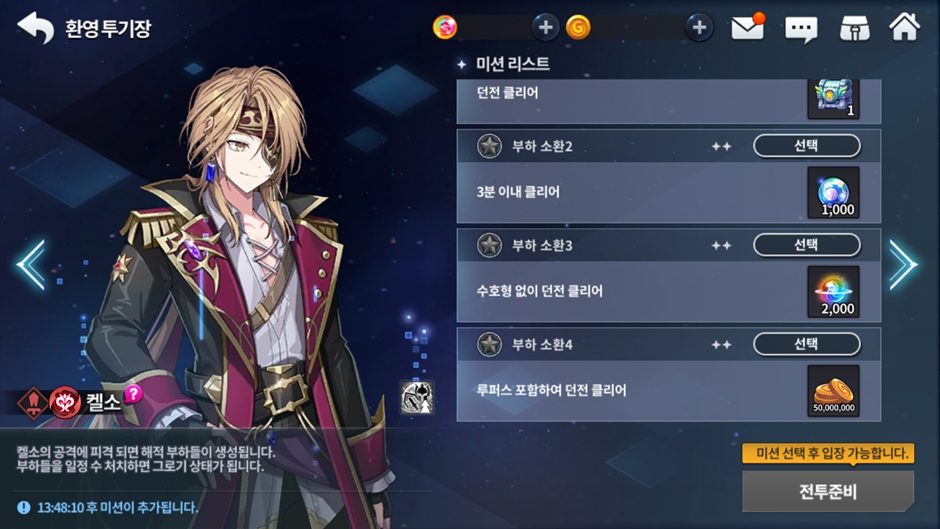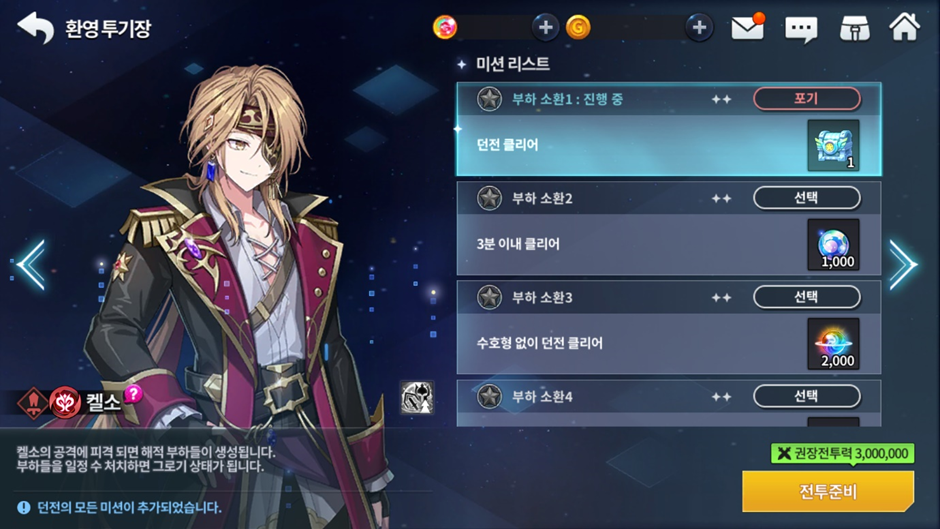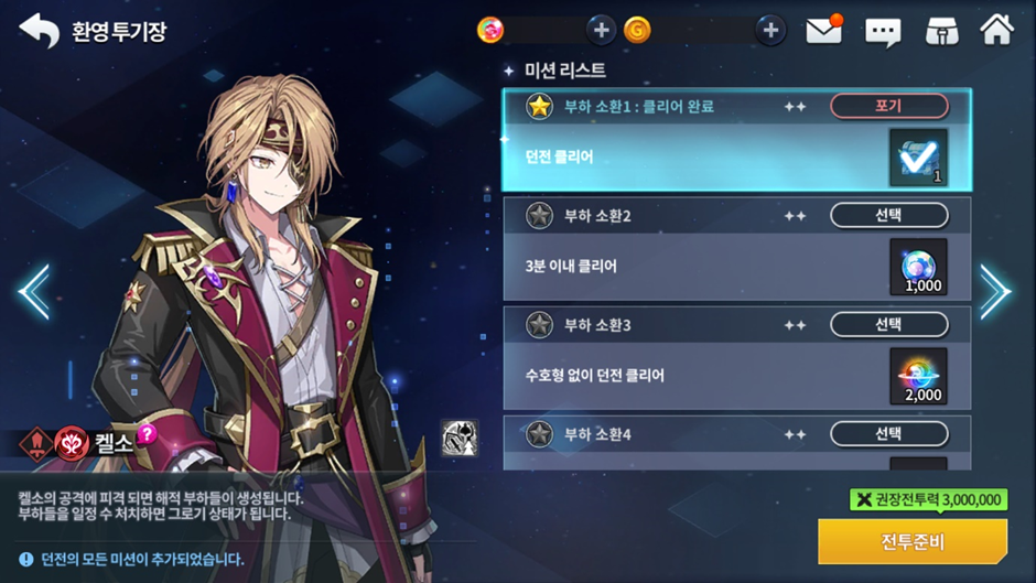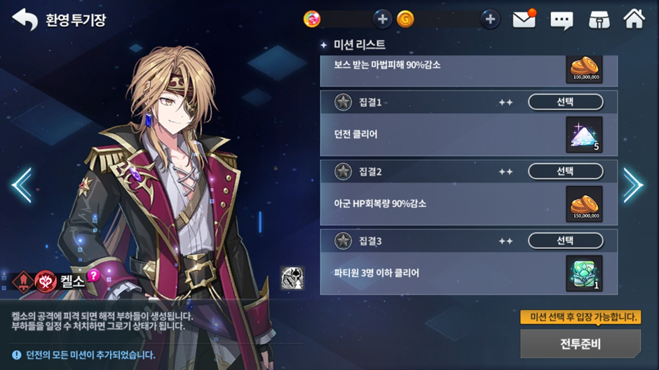 - ‘환영 투기장’에서는 별 미션을 선택해야만 던전에 입장할 수 있으며 클리어 시 선택한 별 미션만 클리어되고 2개 이상의 별 미션을 동시에 클리어할 수 없습니다.