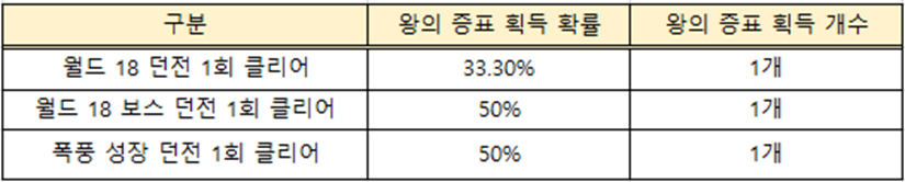 - ‘왕의 증표’는 월드 18 모험 던전과 폭풍 성장 던전 플레이를 통해 획득할 수 있습니다.