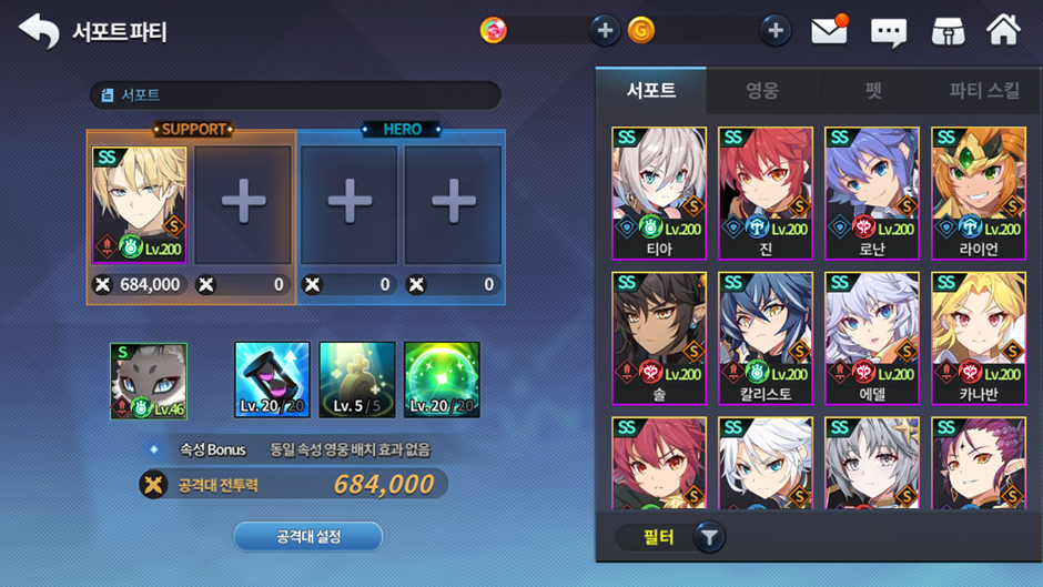 - 데일리 영웅 소환은 SS 영웅 0.5%, S 영웅 10%, A 영웅 89.5% 확률로 소환하게 됩니다.