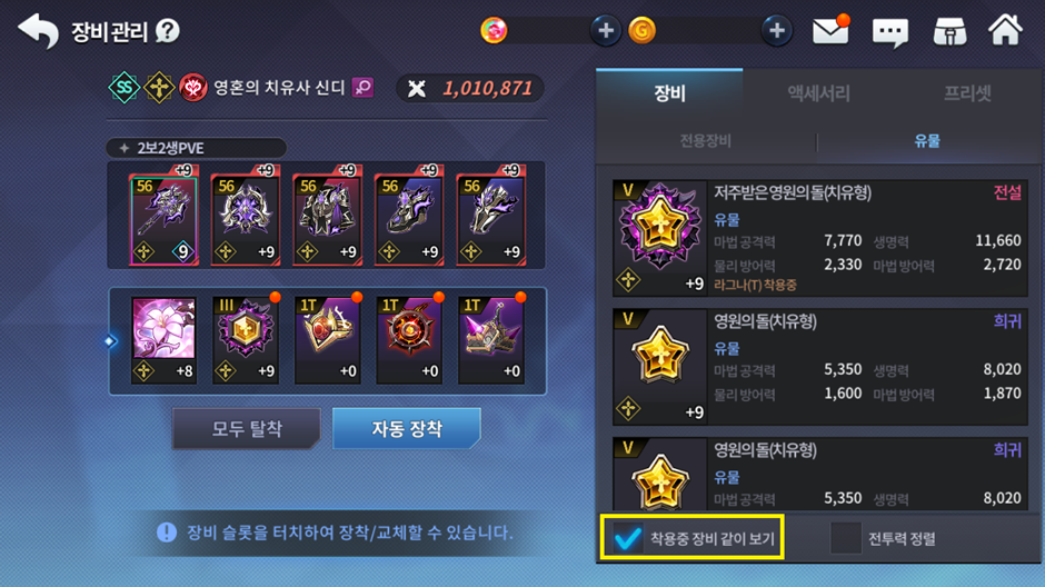 ■ 장비 관리 UI, 룬 장착 UI, 장비 세트 변경 UI 등에서 사용되는 ‘착용 중 장비 보기’ 기능이 ‘착용 중 장비 같이 보기’로 변경됩니다.