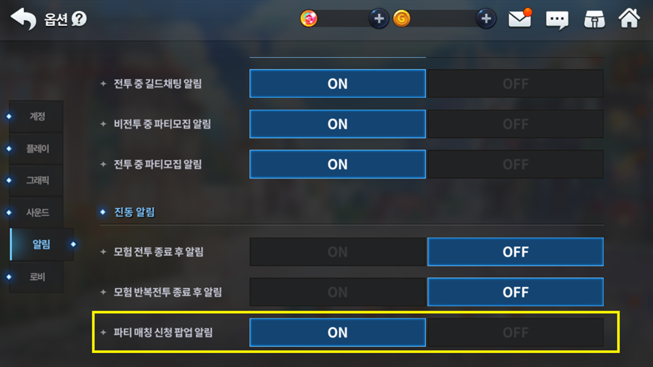 - 메인 로비 ‘메뉴’ – 옵션 – 알림 – 진동 알림 – ‘파티 매칭 신청 팝업 알림’을 통해 ON/OFF 설정이 가능합니다. 5/7 정기 점검 시 기본값이 ON으로 설정됩니다.