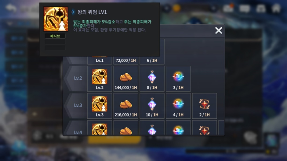 -‘왕의 위엄’ 패시브 효과는 왕의 보물 레벨을 달성하면 자동으로 발동됩니다.