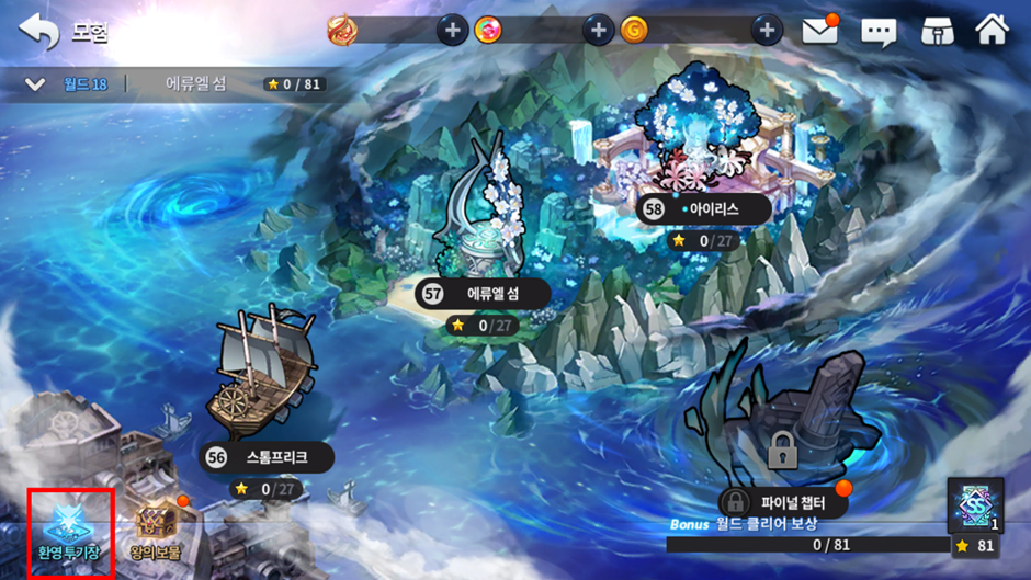 - ‘환영 투기장’은 월드 18 Act 58-9 던전 클리어 및 파티 최고 전투력 300만 이상 달성 시 개방되며, 모험 – 월드 18 – 월드맵 하단 ‘환영 투기장’을 통해 입장할 수 있습니다.