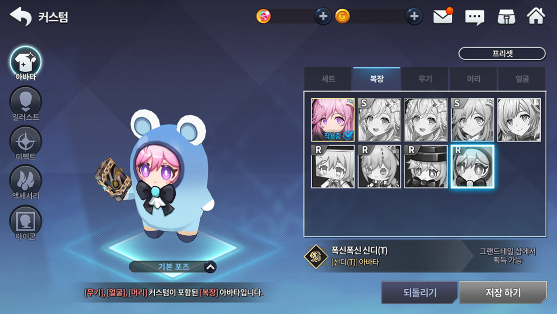 - 블루 마린 신디(T) 아바타 패키지: 기본 아바타, 일러스트, 이펙트, 테두리, 아이콘