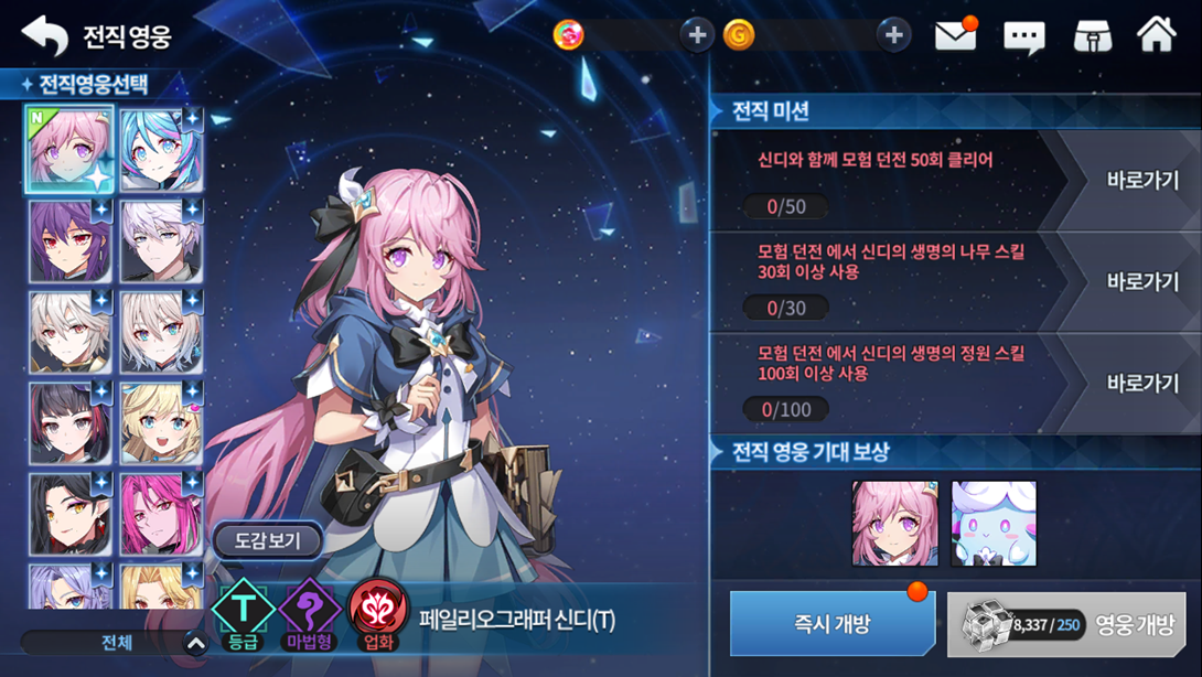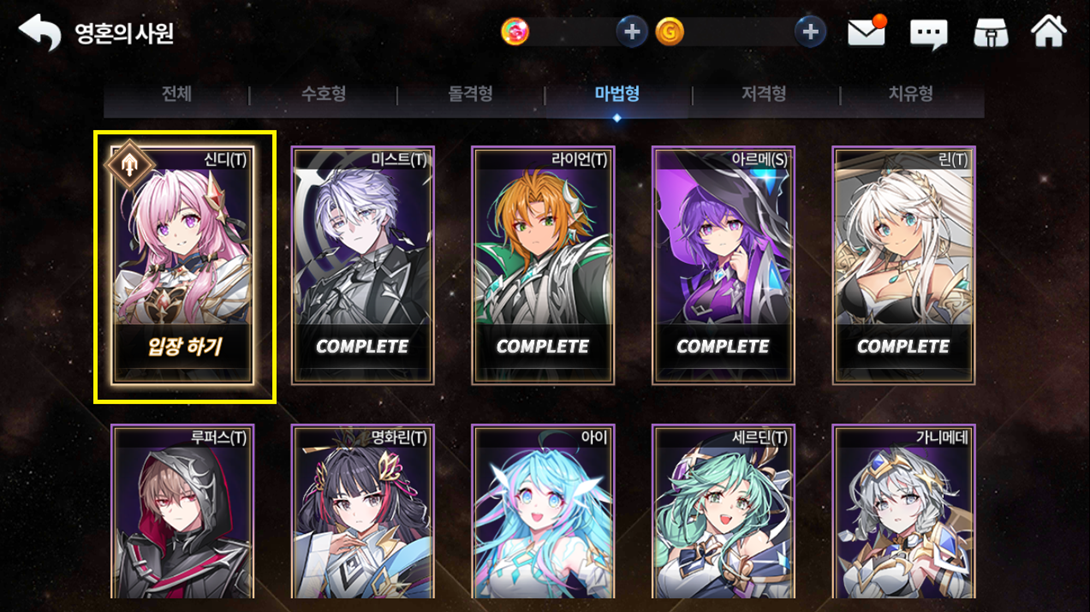 - 전직 미션 완료 및 영웅 개방 이후 '영혼의 사원 > 신디(T)' 터치 후 입장할 수 있습니다.