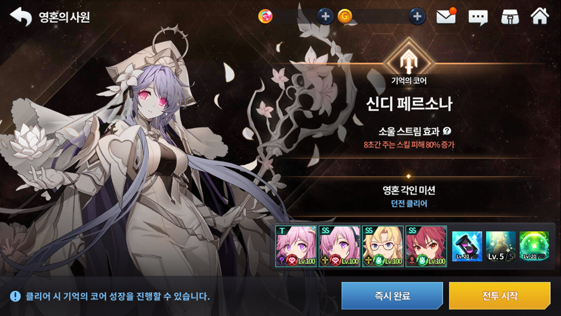 - 영혼의 사원은 해당 영웅을 포함한 고정된 파티를 제공하며 전투 시작을 터치하여 영혼의 사원을 진행할 수 있습니다.