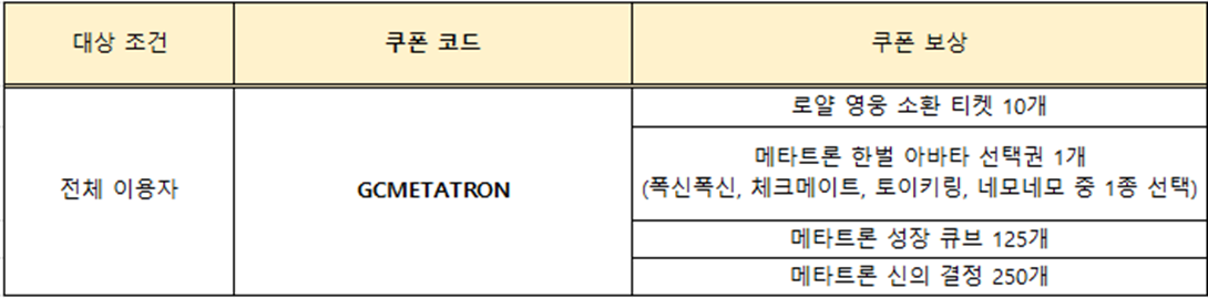 ‘메타트론’의 출시와 함께 메타트론 접속 보상 및 쿠폰 보상 지급 이벤트, 메타트론 강림 이벤트 던전,