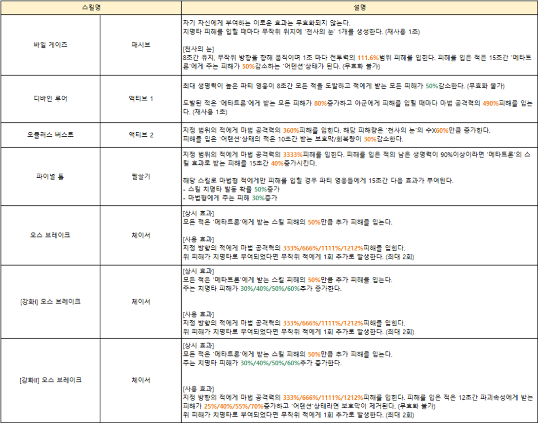 ■ 메타트론 기본 스킬 / 필살기 / 체이서 스킬 주요 효과