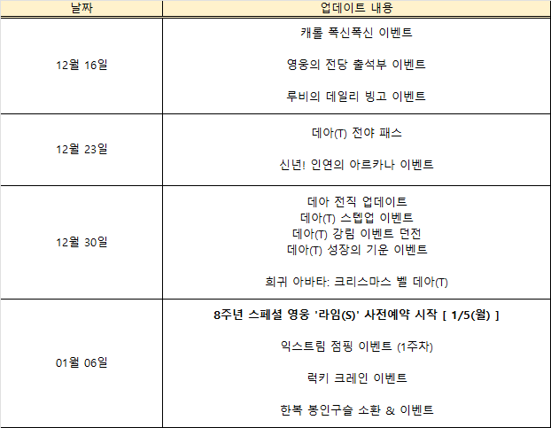 앞으로 영웅님들께서 향후 게임 업데이트 일정을 대략적으로 확인할 수 있으시도록