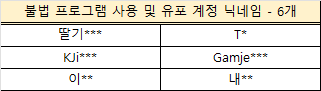 불법 프로그램 사용 및 유포가 확인된 계정 닉네임을 안내드립니다.