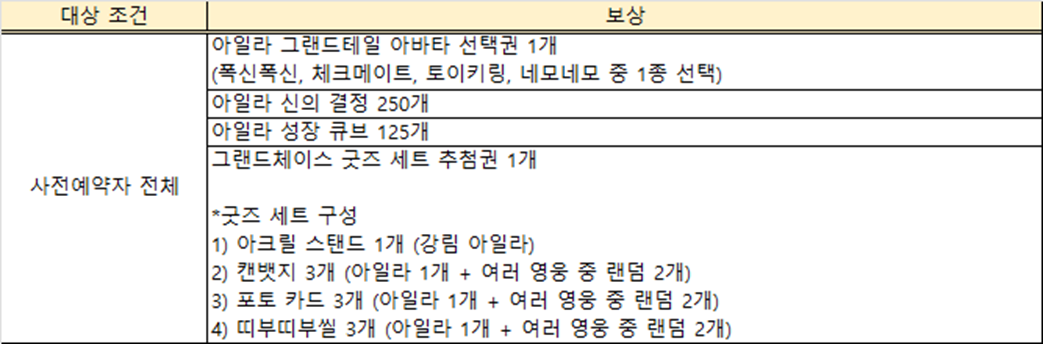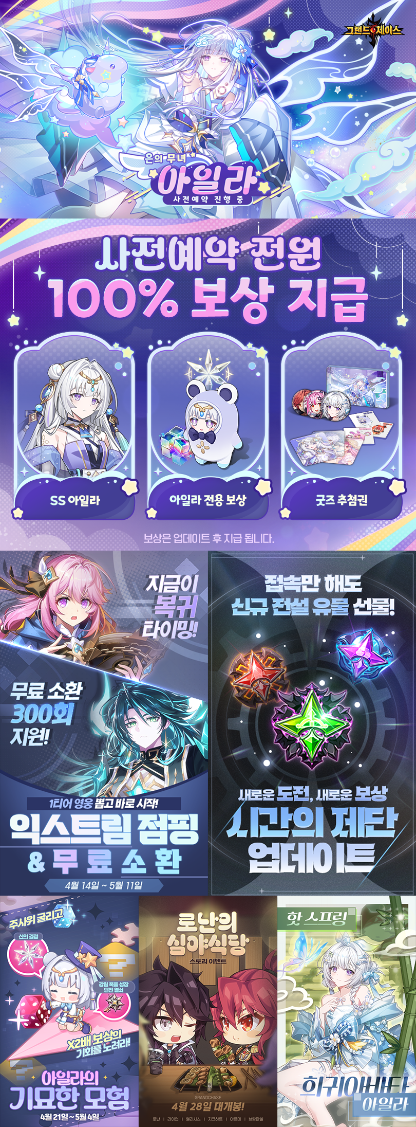 사전예약을 완료하신 영웅님들은 아일라가 업데이트되는 4월 14일 이후부터 SS 아일라를 비롯해 아일라 전용 보상, 그랜드체이스 굿즈 추첨권을 획득할 수 있으니 잊지 말고, 꼭! 사전예약 부탁드릴게요💕