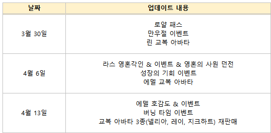 앞으로 영웅님들께서 향후 게임 업데이트 일정을 대략적으로 확인할 수 있으시도록