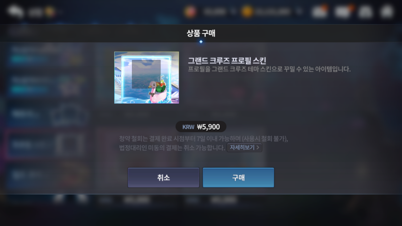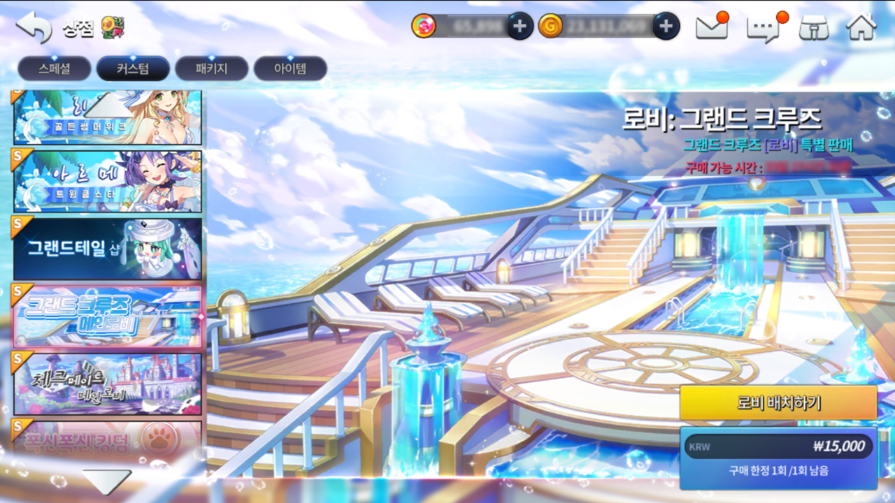 - [상점] → [커스텀 상점] → [로비: 그랜드 크루즈]에서 결제를 통해 구매가 가능합니다.