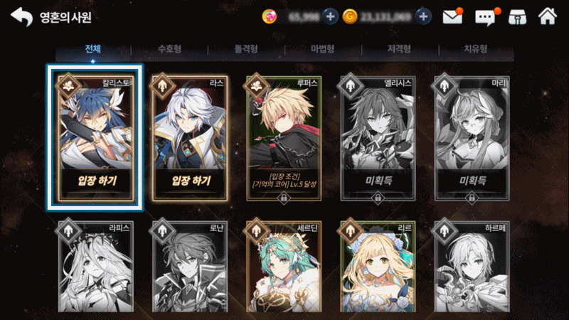 - 5각성 이상 진행한 경우 영웅 목록을 터치하여 해당 영웅의 영혼의 사원으로 입장할 수 있습니다.