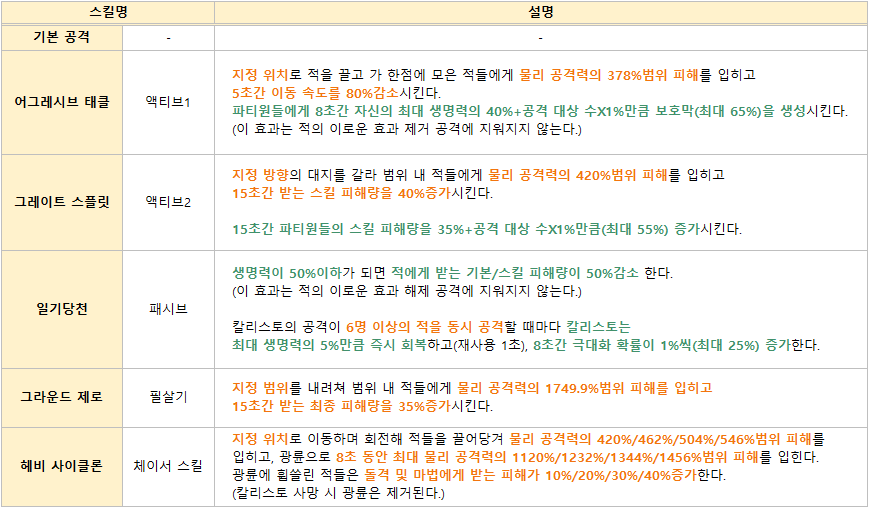 ■ 칼리스토 기본 스킬 / 필살기 / 체이서 스킬 주요 효과