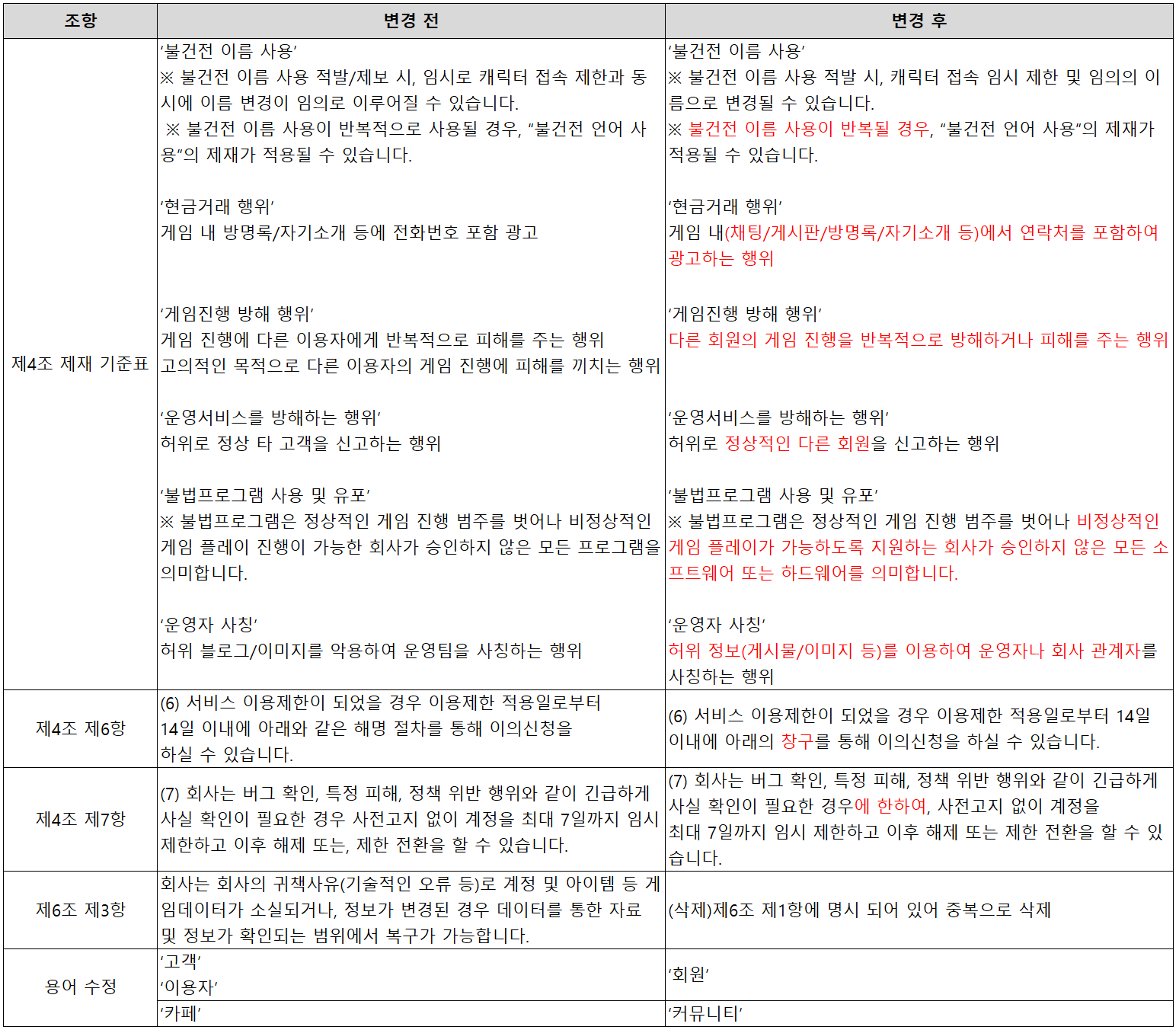 - 개정되는 내용에 대한 문의 및 이의 제기는 이용 중인 각 게임의 ‘고객센터’를 통해 하실 수 있습니다.