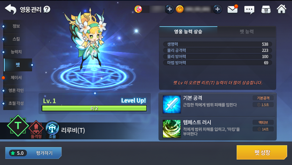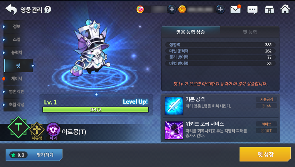 - ‘전직 영웅 펫’은 ‘전직 영웅’ 획득 시 1 Lv 상태로 획득할 수 있습니다.