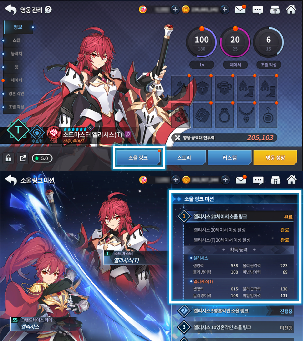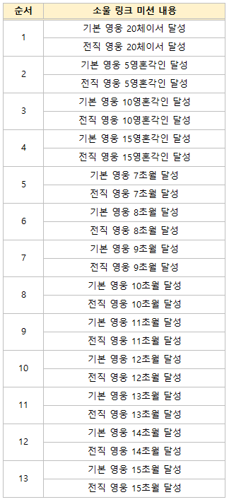 - 소울 링크 시스템은 소울 링크 미션 완료 시 기본 영웅과 전직 영웅의 기본 능력치가 상승하는 시스템입니다.
