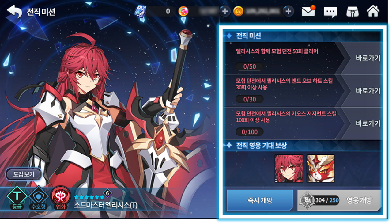 ■ ‘전직 미션’을 수행하고 영혼 각인 큐브 250개를 재료로 사용하여 전직 영웅을 개방할 수 있습니다.