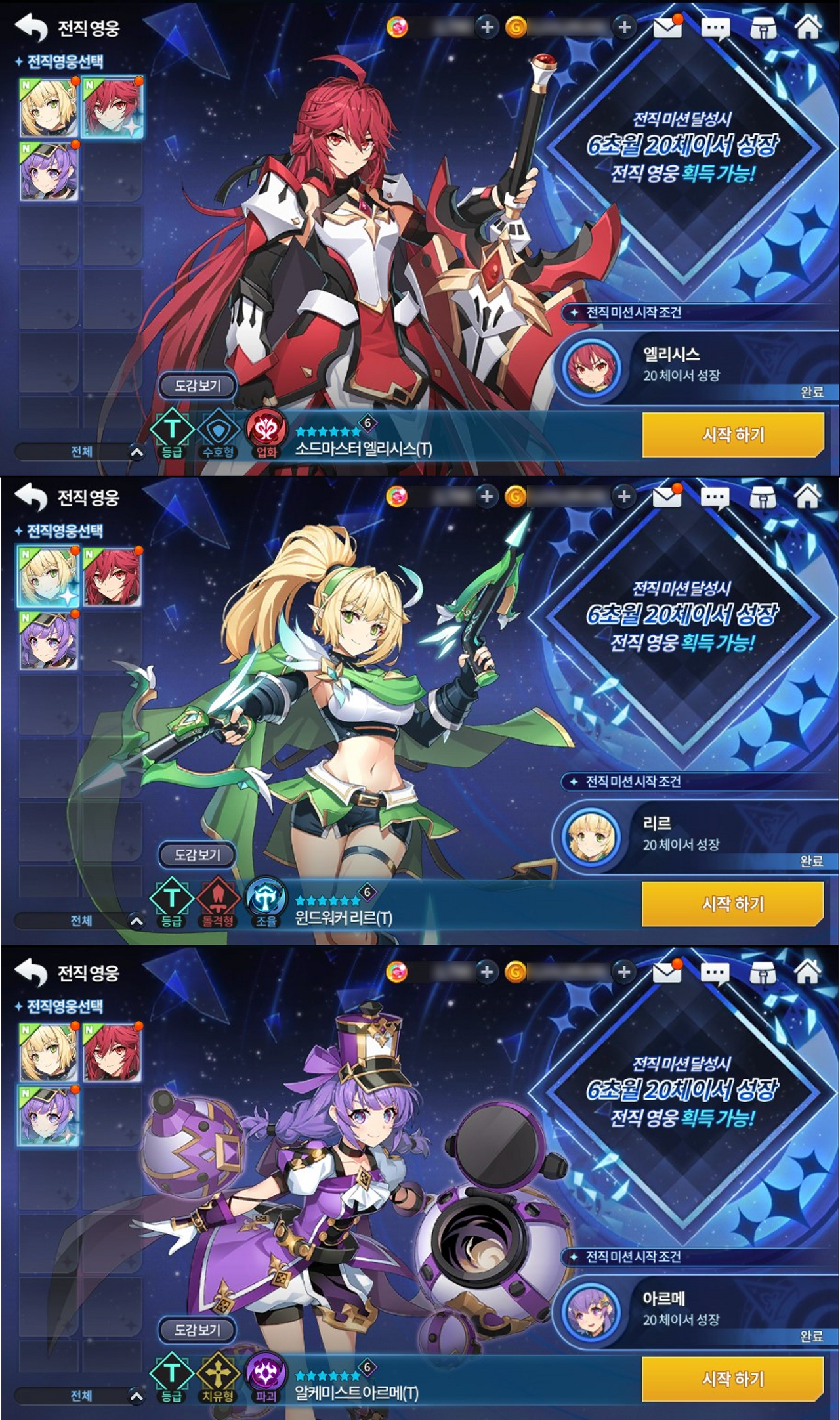 ■ 신규 SS등급 전직 영웅 ‘엘리시스(T)(수호형)’, ‘리르(T)(돌격형)’, ‘아르메(T)(치유형)’가 출시됩니다.