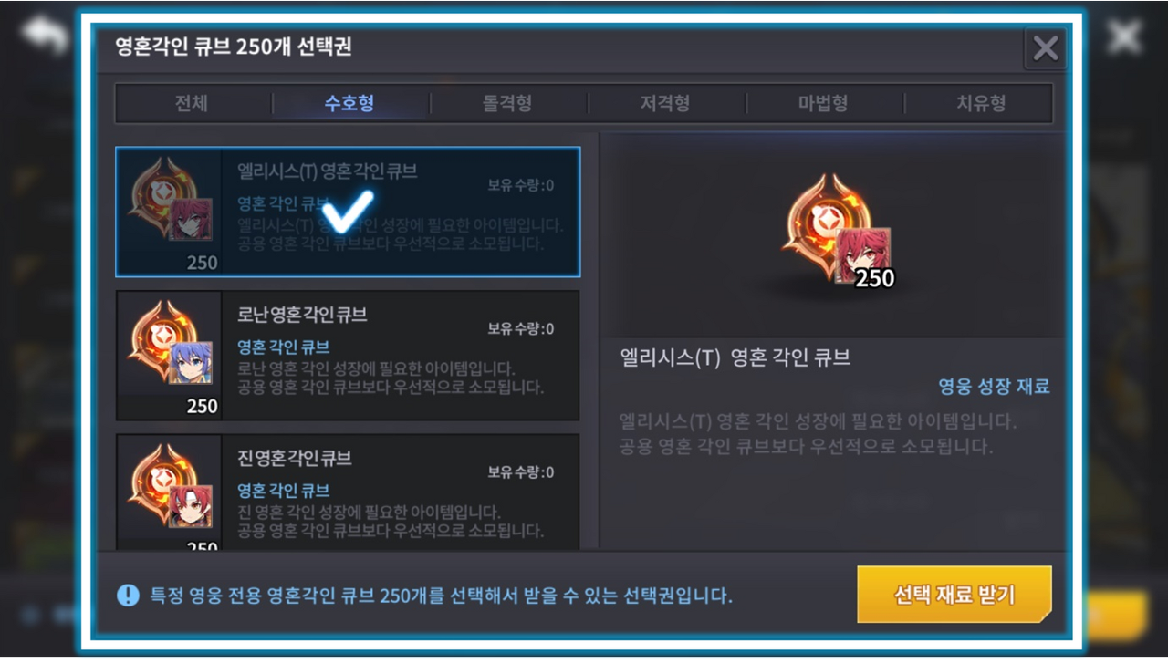 기본 영웅 전용 큐브(체이서 큐브 / 영혼 각인 큐브)는 사용할 수 없습니다.
