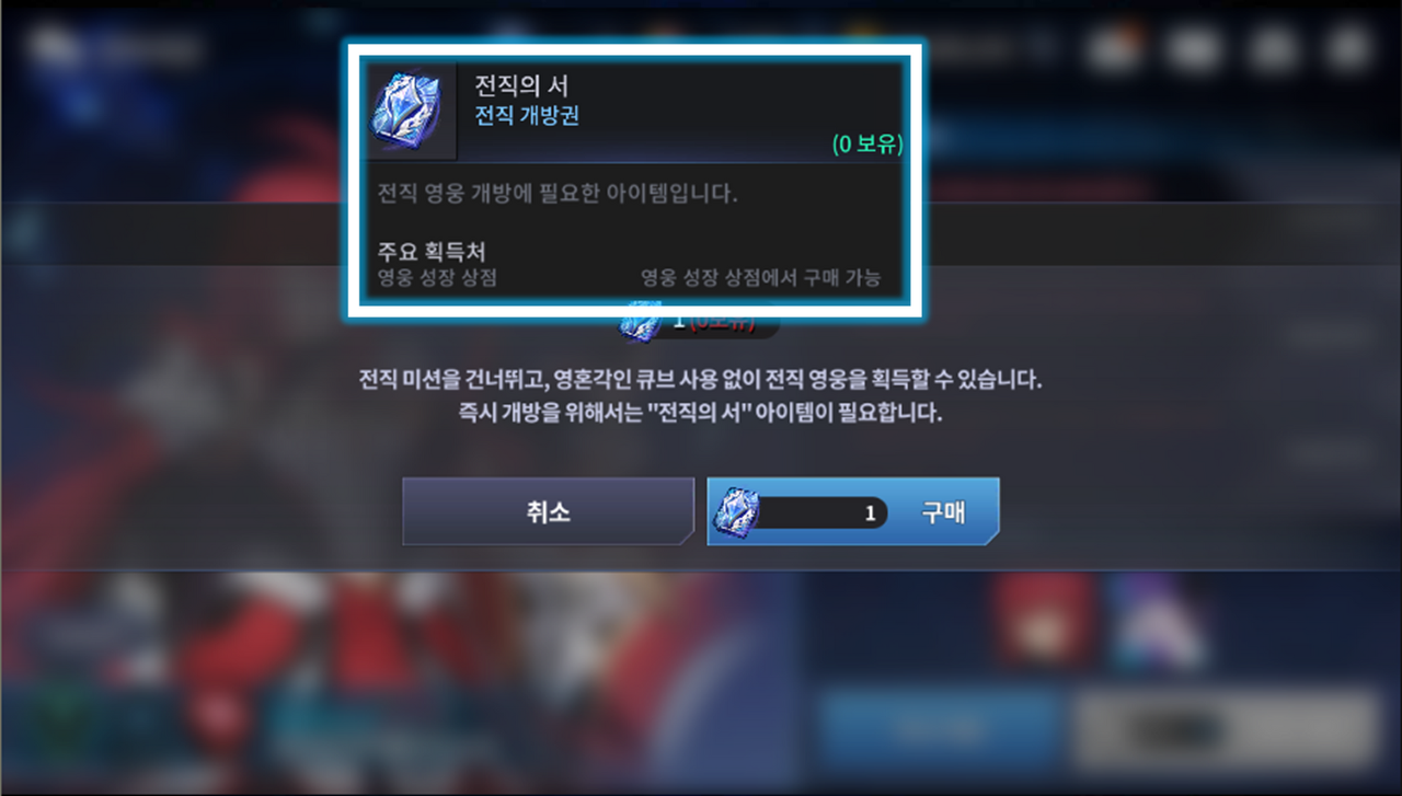 - ‘전직의 서’를 사용하면, ‘전직 미션’과 ‘영혼각인 큐브 250개 소모’ 조건 없이 전직 영웅을 즉시 개방할 수 있습니다.