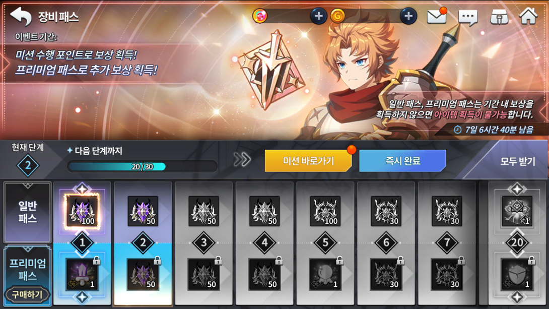 ※ 일반 패스 진행 중 프리미엄 패스를 구매할 경우, 진행 완료한 단계까지 일괄적으로 보상 획득이 가능합니다.