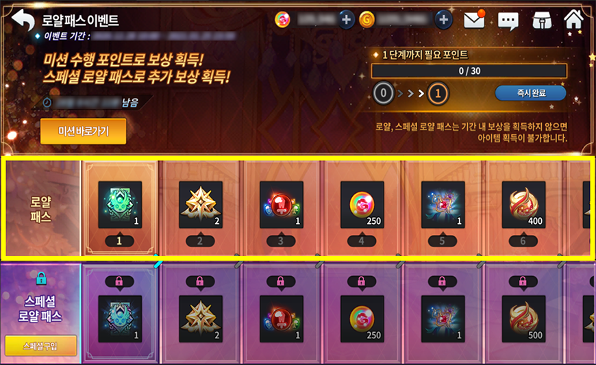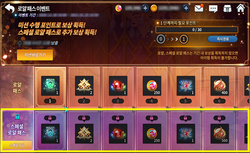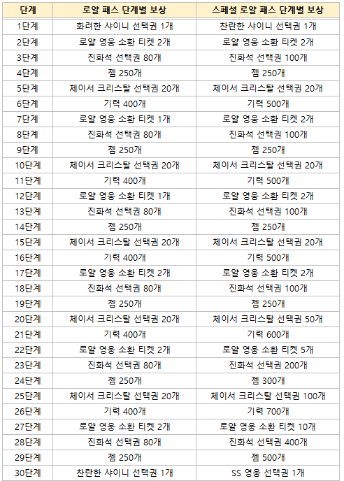 [로얄 패스 이벤트 로얄/스페셜 로얄 단계별 보상]