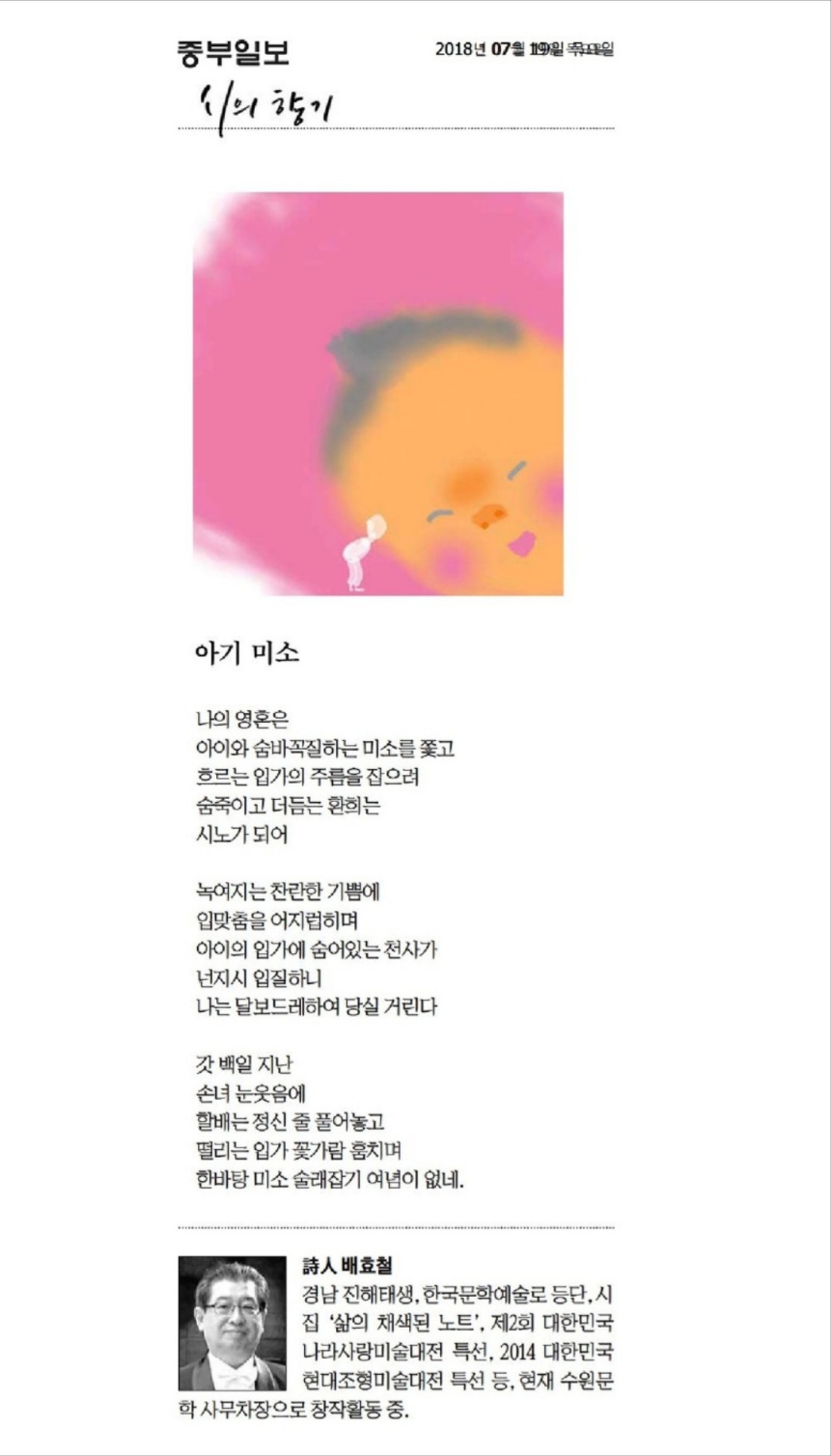 아기미소 작성자여산 배효철|작성시간23.11.18|조회수25 목록 댓글 0 글자크기 작게가 글자크기 크게가 아기 미소 - https://bhc5005.tistory.com/m/663아기 미소아기 미소 배효철 나의 영혼은 아이와 숨바꼭질하는 미소를 쫓고 흐르는 입가의 주름을 잡으려 숨죽이고 더듬는 환희는 시노가 되어 녹여지는 찬란한 기쁨에 입맞춤을 어지럽히며 아이의 입가bhc5005.tistory.com 다음검색 현재 게시글 추가 기능 열기 북마크 공유하기 신고 센터로 신고 댓글 댓글 0 댓글쓰기 답글쓰기 댓글 리스트