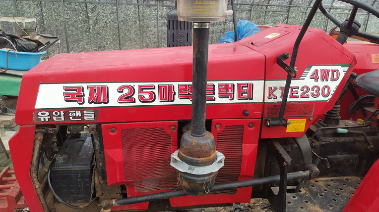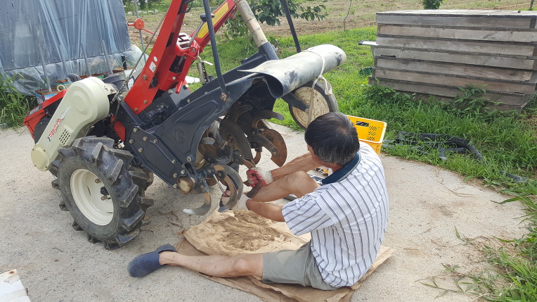 감자캐기를 마친 경운기 로터리에 발을 끼우는 양춘형님