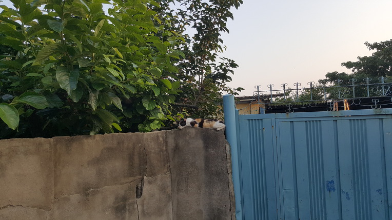 저녁 산책길에 만난 마을 담장위에 편안하게 휴식중인 고양이
