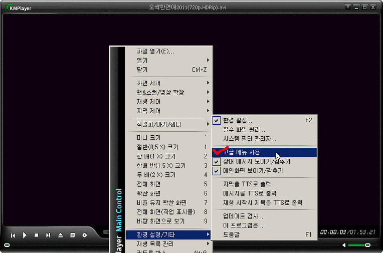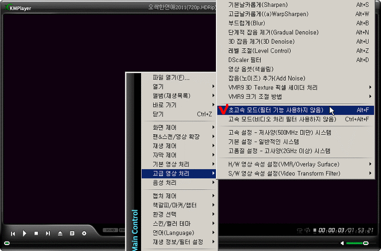 ① KM 플레이어 재생 - 마우스 오른쪽 클릭 - 고급영상처리 - 초고속 모드 선택  (※ 고급영상처리 메뉴가 보이지 않는 분은 아래 ② 참고)