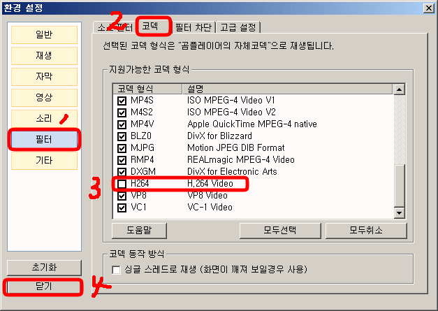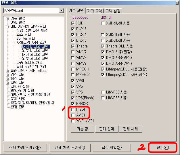 즉, KM 플레이어 자제 코덱의 작동을 해지하고, 외부코덱인 CoreAVC 코덱이 우선적으로 작동하게 설정해줍니다.