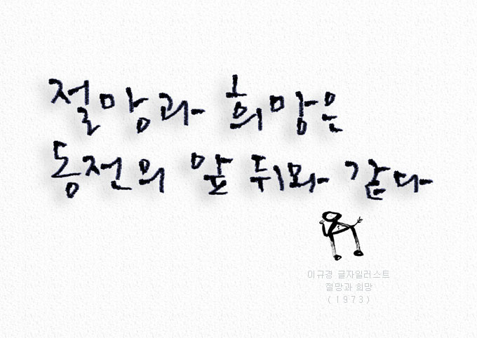절망과 희망-그림글자,캘리그라피,글자일러스트 작성자김유경|작성시간18.11.27|조회수254 목록 댓글 0 글자크기 작게가 글자크기 크게가 절망과 희망-그림글자,캘리그라피,글자일러스트 다음검색 현재 게시글 추가 기능 열기 북마크 공유하기 신고 센터로 신고 댓글 댓글 0 댓글쓰기 댓글 리스트