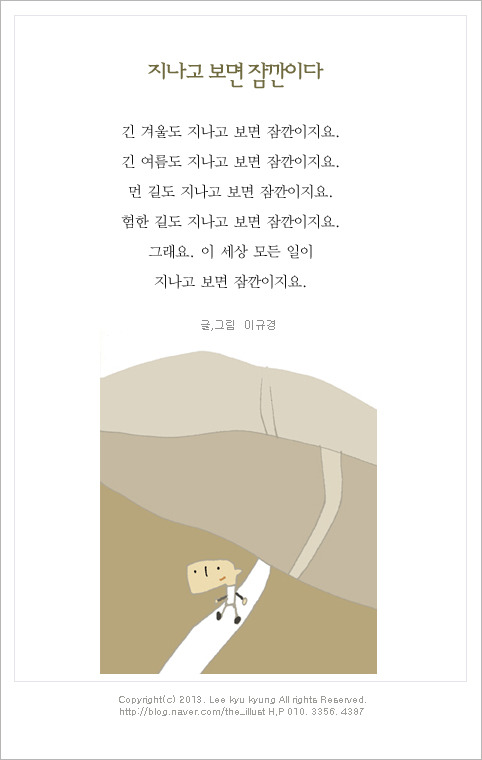 92, 지나고 보면 잠깐이다 - 그림,글,이미지,미술,일러스트,마음,생각,웃음 작성자김명주|작성시간13.01.16|조회수50 목록 댓글 1 글자크기 작게가 글자크기 크게가 지나고 보면 잠깐이다 글,그림 이규경 다음검색 현재 게시글 추가 기능 열기 북마크 공유하기 신고 센터로 신고 댓글 댓글 1 댓글쓰기 댓글 리스트 작성자grace리 | 작성시간 13.01.17 그렇네요 ^^ 댓글 전체보기