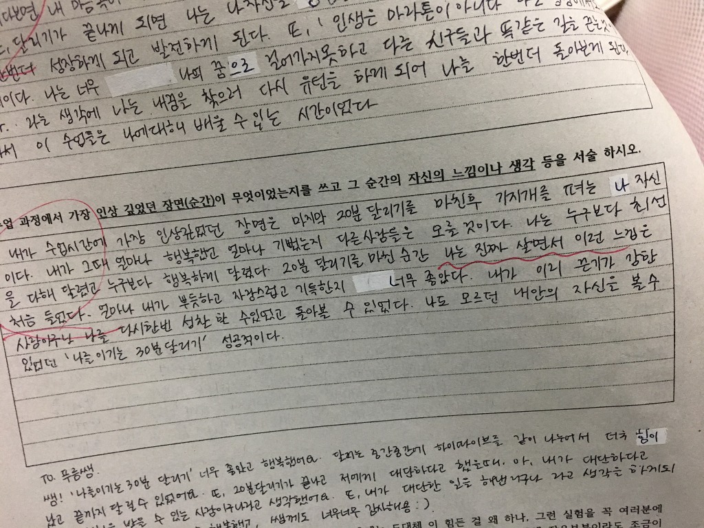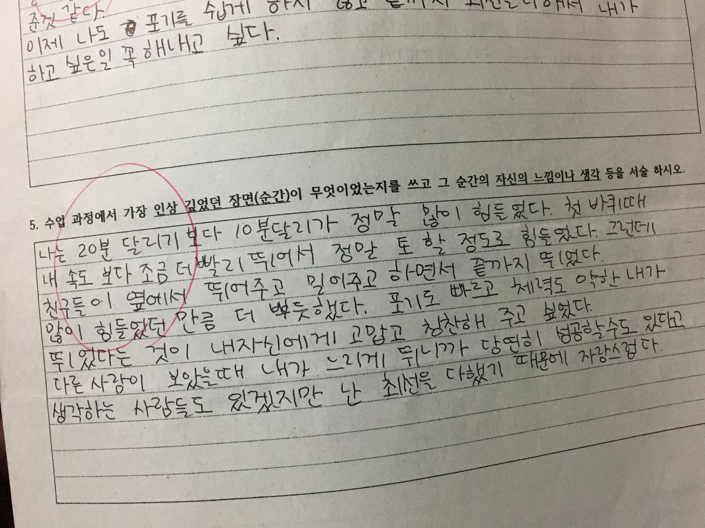 이렇게 25점 자리 수행평가가 끝났지만 '나를 이기는' 30분 달리기 수업은 아직 2차시가 더 남아 있습니다 : )