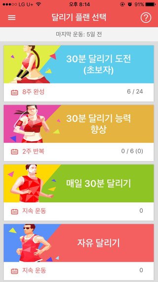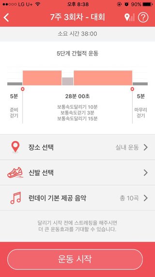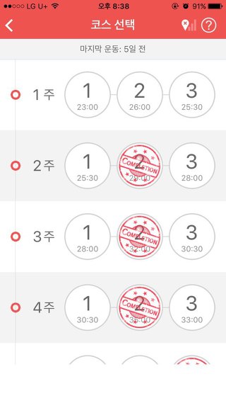 위 에 보이시는 사진은 런데이 앱이구요 보시는 바와 같이 주차별로 시간과 달리는 정도가 다릅니다. 단계별 난이도는 상황에 맞게 조절하시면 될것 같습니다.