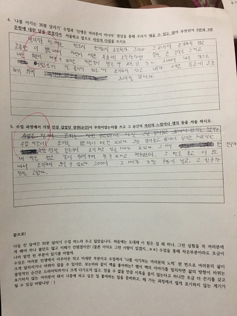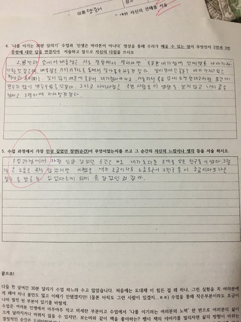 4. 2번과 3번 문항에 대한 답을 연결지어 ‘나를 이기는 30분 달리기’ 수업과 ‘인생은 마라톤이 아니다’ 영상을 통해 우리 가 배울 수 있는 점이 무엇인지 서술하고 앞으로 자신의 다짐을 쓰시오