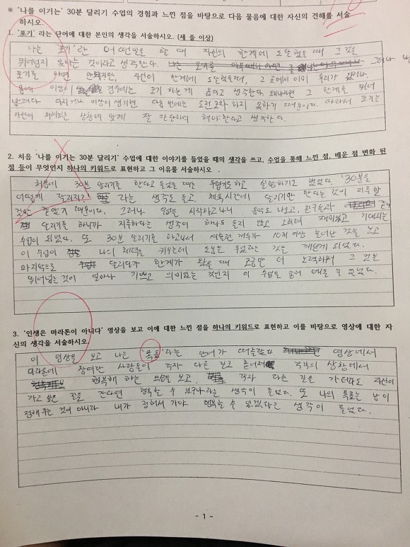 오리엔테이션 떄 보여줬던 인생은 마라톤이 아니다 라는 영상을 보여주고 아래와 같은 주제로 논술 시험을 치뤘습니다.