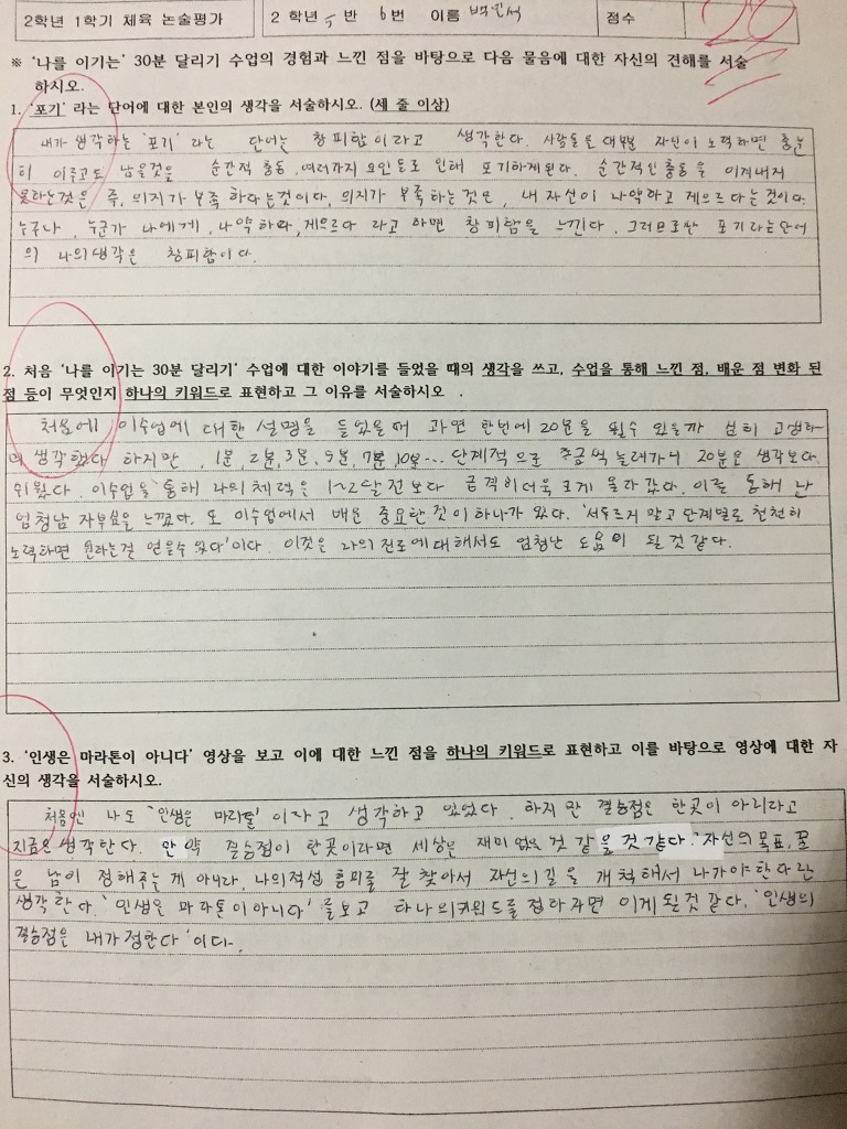 ‘나를 이기는’ 30분 달리기 수업의 경험과 느낀 점을 바탕으로 다음 물음에 대한 자신의 견해를 서술