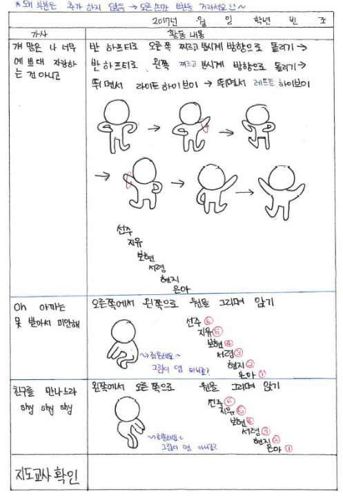 아래 사진은 매 수업 시간에 진행된 안무 구상지 입니다.