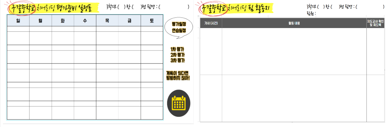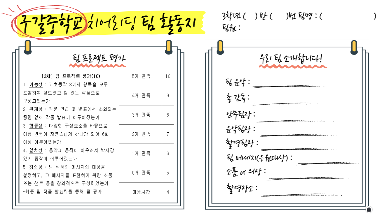 - 그렇게 해서 만들어진 팀은 1학급 당 3팀(1팀당 10명 씩)이 결성되도록 했다. 그 이후 팀 회의를 통해 팀명, 팀 음악, 1인 1역할 분담(총 감독, 안무팀장, 음악팀장, 촬영팀장 등), 응원대상, 소품(의상), 촬영 장소 등을 정하고 팀 간 발표하는 시간을 가졌다.