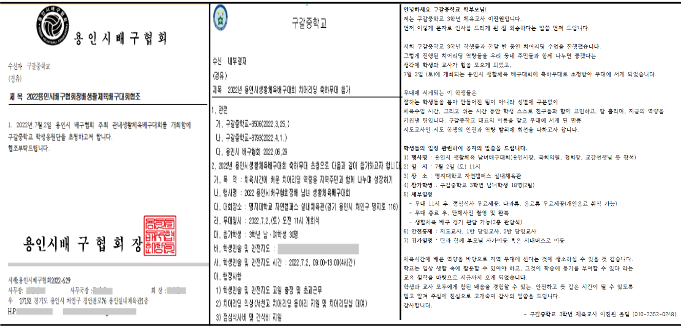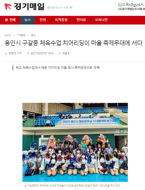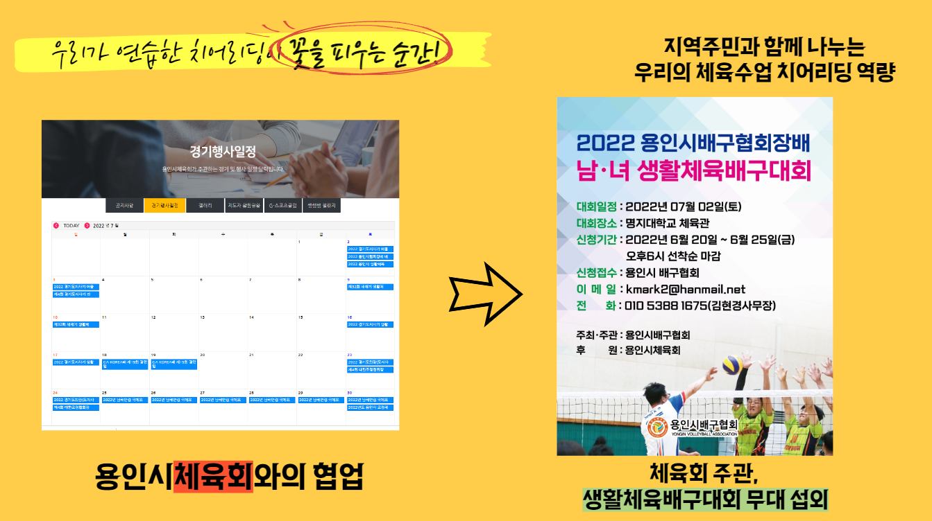 - 용인 명지대학교 실내체육관에서 열린 생활체육 배구대회의 무대에 동료 친구들 뿐만 아니라 학교 학부모님들이 많이 찾아주셨다. 학교 체육수업 시간에 배운 치어리딩 역량이 학교 밖에서 꽃 피우는 순간이었다. 수행평가를 위한 체육수업이 아니라 수업에서 배운 지식, 기능, 태도가 학교 밖에서 실제적으로 활용되는 경험을 통해 학생들은 학교의 배움이 곧 삶의 배움이라는 것을 배웠을 것이라 생각한다.