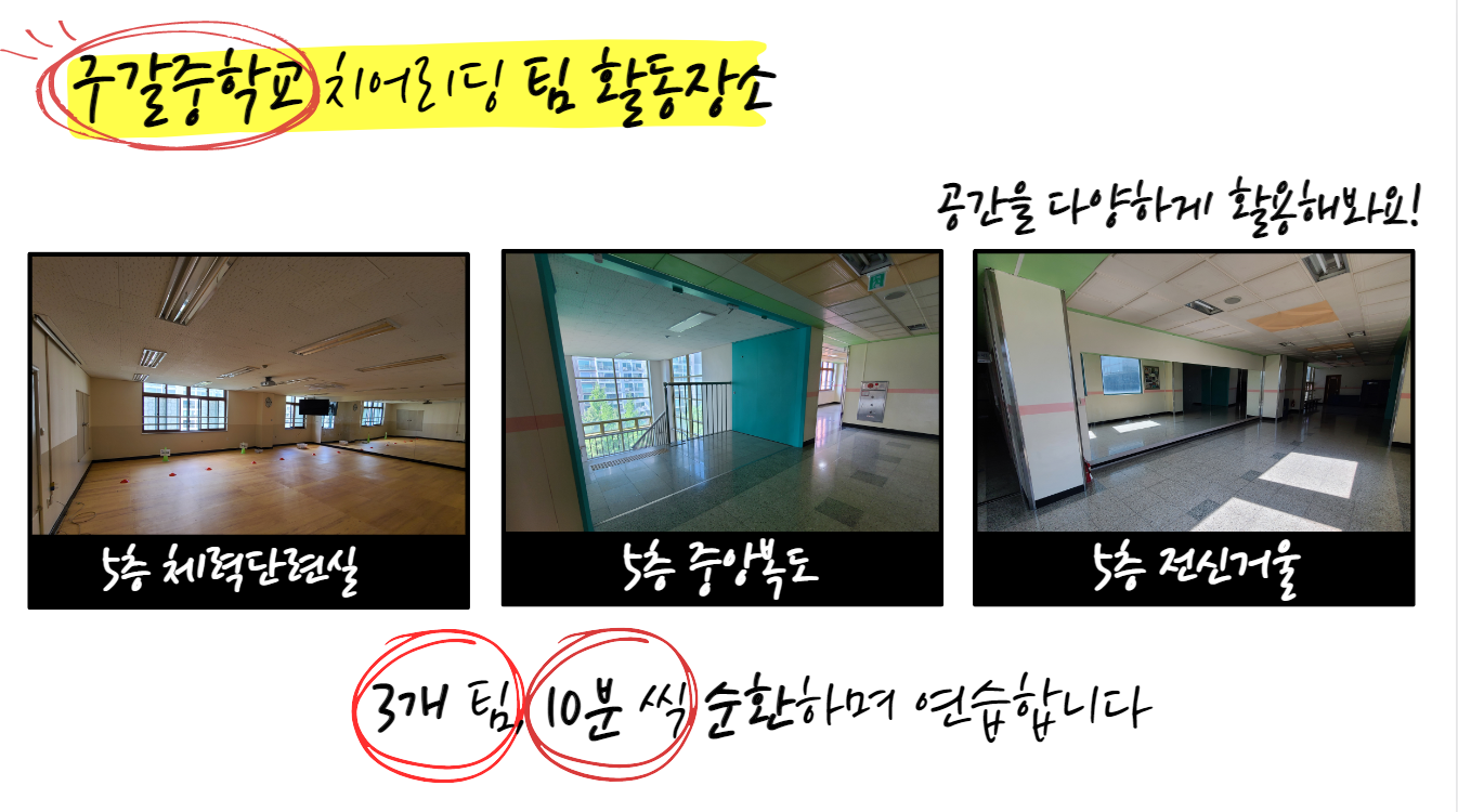 - 연습장소는 전신거울이 있는 교실 크기 장소의 체력단련실에서 모두가 연습하기에는 어려웠다. 그래서 같은 층 여러 공간을 활용하기로 했다.
