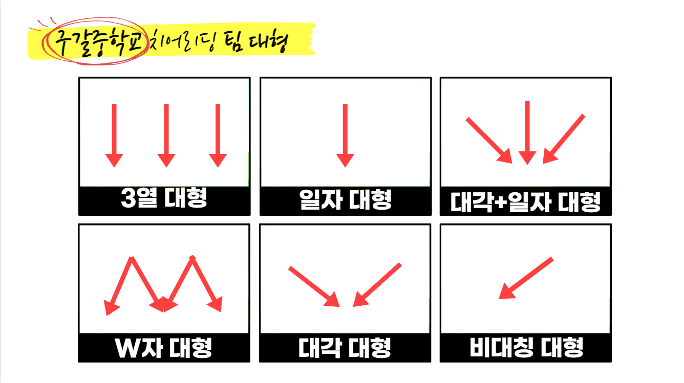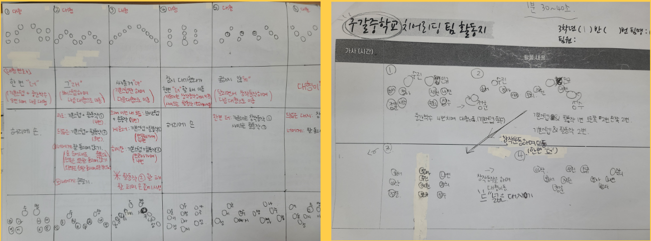 - 팀별로 음악에 맞춰 안무를 구상할 때는 최소 6번의 대형변화를 하도록 조건을 달았다. 학생들에게 제공되는 활동지 (3장)에 팀 대형 예시를 함께 첨부하여, 이를 활용하며 팀 안무를 구상하도록 했다.