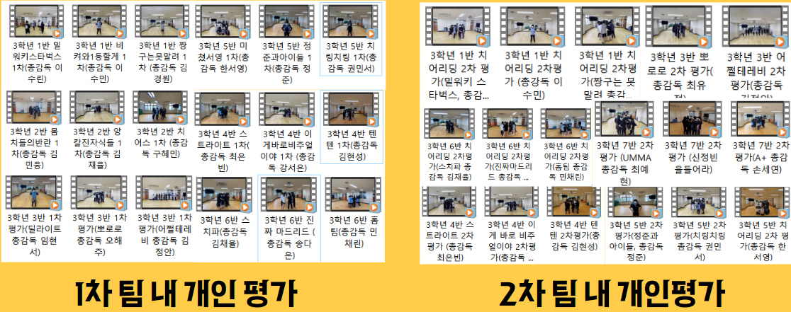 - 평가는 대면으로 이루어지지만 이 때 영상 1차와 2차 각각을 촬영하여, 평가자는 영상 속 팀 내 개인평가를 진행했다.