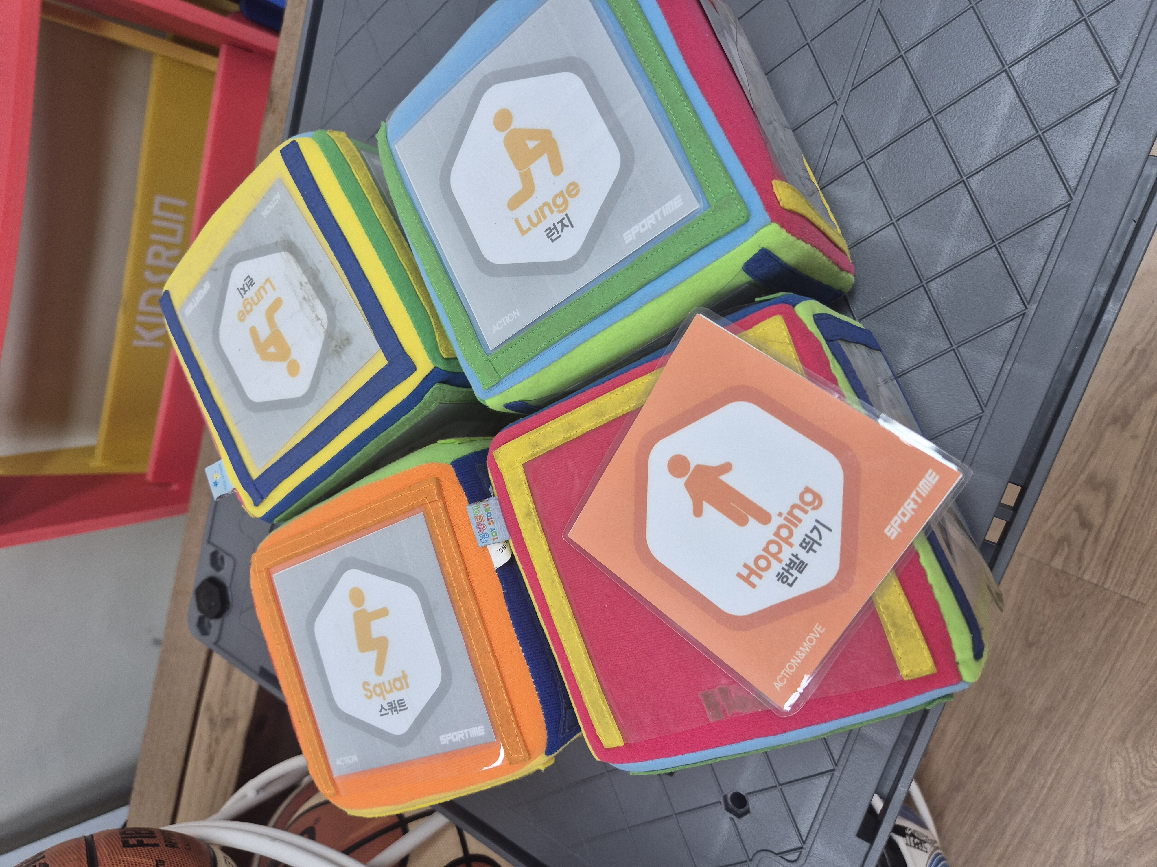 3. 신체활동과제 주사위인데요, 영어실에서 쓰다 버린 주사위에 신체활동과제를 출력해서 끼웠어요. 파는 것도 있지만 학교에 있는 것들을 이용해 만드는 편입니다. (높이뛰기 스탠드로 앵글볼골대도 만들기도^^)