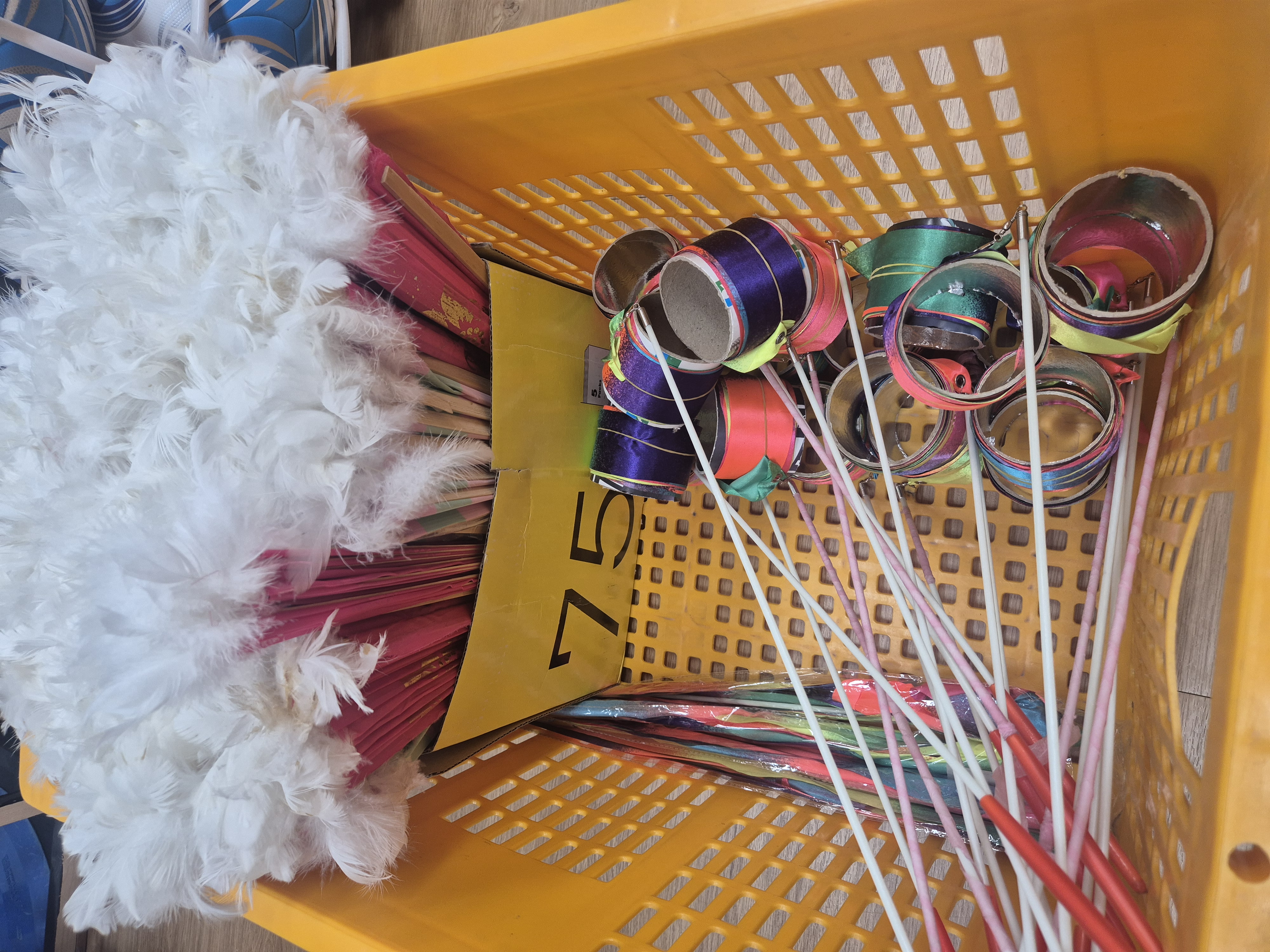 2. 초등 표현활동에 리본이 있는데 모아놓으면 항상 엉켜요. 선수들이 둥근 통에 넣어놓는 것에 착안하여 셔틀콕통을 잘라 감아놓고 고무밴드로 마무리하여 정리했습니다. 수업이 끝나면 4학년 아이들도 자기 리본 정리를 깔끔하게 해서 냅니다.