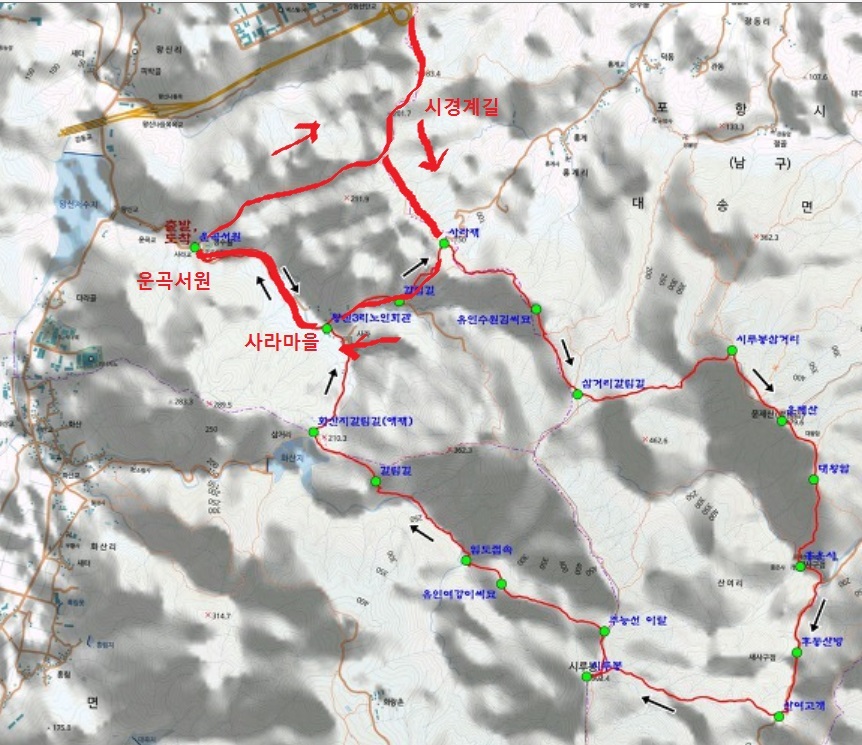 산행코스:운곡서원 주차장-운곡서원-능선(묘 많이있음)-시멘트길 만나서 직진-희미한 능선길-시경계길-자동차 전용도로-되돌아 시경계길-사라재-사라마을-운곡서원 주차장(약 3시간)
