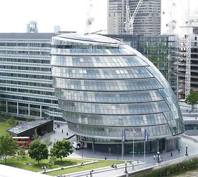 2002년 완공된 템즈강 남쪽에 위치한 런던 시청은 런던 타워와 함께 템즈강 남쪽의 랜드마크로 많은 관광객들의 사랑을 받고 있다. 기존의 딱딱한 공공청사의 이미지에서 탈피한 둥근 구 형태의 건물은 강변의 자갈을 모티브로 한 독특한 입면으로 인해 모든 면에서 정면성을 가지게 된다. 일명 ‘유리달걀(The Glass Egg)’로도 불린다. 10층 규모의 45m 높이의 런던 시청은 친환경적 건축 환경 구현이라는 포스터의 건축사상의 결과물이다. 동일한 규모의 육면체 건축물에 비해 표면적이 약 25%정도 절감되며 건축물을 남향으로 기울게 설계해 태양의 일사량에 노출되는 면을 줄이고 자연스러운 그늘을 만들었다. 인텔리전트 빌딩(intelligent building)에서 간과하기 쉬운 자연환기를 완벽하게 도입함으로써 한여름에도 냉방비가 거의 들지 않는다. 결과적으로 공사비 및 건물의 유지관리비용 또한 많은 절감 효과를 유발한다. 기존의 런던 타워 브리지의 고전적인 이미지와 런던 시청의 현재적인 이미지의 강한 대비감이 새로운 런던의 랜드마크가 됐다. 동시에 템즈강 남측 공공개발의 촉매 역할을 한다.